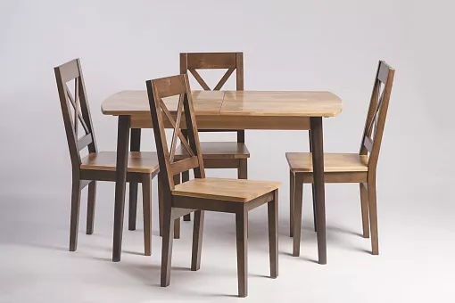 также 4 цвета нитролаковой покраски: бесцветный натуральный тон, шоколад, орех, венге.В коллекции представлены обеденные столы: прямоугольные, круглые раздвижные и нераздвижные компатных и больших размеров.