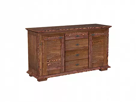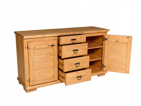 Серия мебели Хлоя из массива сосны. На крышках и и фасадных элементах толщина 3 см. толщина остальных деталей 1,5-2 см. Фурнитура выполнена из метала так же в изделии присутсвуют кованные элементы. Ящики с шариковыми направляющими. Фасады типа Жалюзи не сковозные что защищает внутренние отделения от пыли и света.