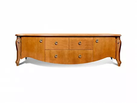 Плавные линии, изгибы, профильные поверхности придают набору лёгкость, очарование эпохи прошедших веков, при этом оставаясь удобным и практичным. Вместительные витрины, комоды не разочаруют, столовая группа из стола и стульев словно приглашает провести вечер при свечах. Изделия имеют несколько цветовых решений: классический благородный — «коньяк», нежный , утончённый – «белая эмаль с серебряной патиной» и неординарный, удивительный – «кракелюр».