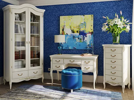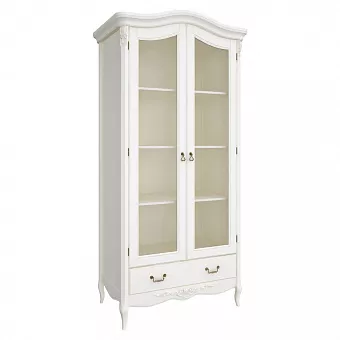 Просторный стеллаж для частной библиотеки имеет два прозрачных стеклянных фасада и пять просторных отделений для книг. Дополнительно в нижней части шкафа находятся два ящика. Стиль исполнения – французская деревенская классика, которой присущи нотки романтики, роскоши и аристократизма. В качестве основного цвета используется «слоновая кость»
