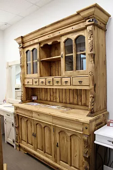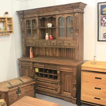 Прекрасный буфет для Вашего дома. Подойдет для вашего загородного дома как нельзя лучше. Прочный, колоритный и вместительный. Часто устанавливается в банях и столовых, имеется 10 ниш для бутылок с вином или иными напитками. Множество ящиков и шкафчиков могут вместить огромное количество посуды и продуктов при необходимости. Первый буфет появился в эпоху средневековья, а затем полностью оформился в шкаф с дверцами для посуды во Франции лишь пару столетий спустя. Причем даже в те времена буфеты изготавливали различными, в зависимости от того, для кухни, столовой или гостиной предназначена эта мебель. Так, самые первые буфеты могли иметь один и несколько ярусов, а также отличаться наличием (отсутствием) запоров и дверей, несколькими или одним отделением, полочками… На современном рынке буфеты также представлены в широком разнообразии, причем наибольшей популярностью традиционно пользуются, так называемые угловые буфеты. Мебель именно такой конструкции спешим предложить вам мы. Так, обратите свое внимание на буфет из коллекции Викинг, который отличается своим стилем кантри, а также полной экологичностью (для создания изделия использовалась древесина сосны). Полезный совет: Влажность в том помещении, в котором вы планируете расположить мебель из древесины сосны, не должна быть слишком высокой, поскольку это может привести к деформации подобного изделия, которая проявится сначала в скрипе, а затем и в постепенном расшатывании (вплоть до разваливания на части).