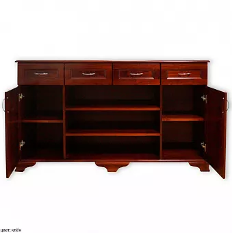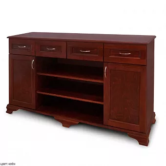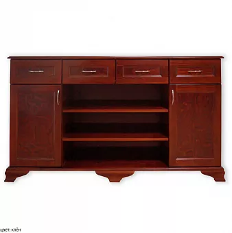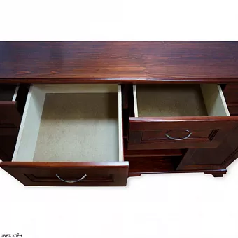Комод "Майорита 2.4". Фасады выдвижных ящиков выполняются с имитацией филёнки фигурной фрезой и металлическими ручками. Особенность этого комода - фигурная фаска по верхнему периметру и отсутствие открытой ниши. Сочетание натуральной древесины и современных эколаков - залог экологичности и безопасности мебели для дома.