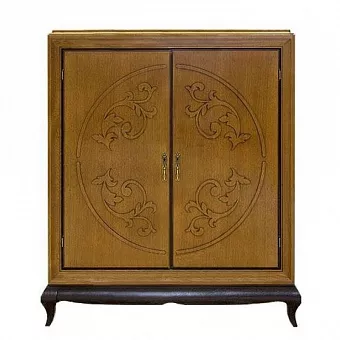 Набор выполнен с использованием массива дуба и шпона на лицевых поверхностях. Украшает набор витиеватая инкрустация деревом по дереву, повторяющаяся в каждом изделии, что всё вместе создаёт единую композицию, показывает индивидуальность и неповторимость набора. Цокольное основание изделий на профильных ножках, приподнимает изделия над поверхностью, придавая им лёгкость и радуя глаз. В ящиках вкладыши облицованные тканью. Стеклянные филёнки с декоративным узором. Тумба с откидной стеклянной дверью.