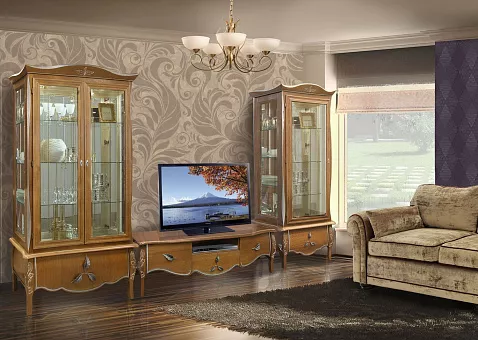 Набор выполнен с использованием массива дуба и шпона на лицевых поверхностях. Украшает изделия использование двух контрастных цветов, лицевая фурнитура в виде лепестков, объёмный вид накладок ящиков. Крышка тумбы прикроватной, ножки, карниз, рамы дверей, зеркала, вертикальные бруски стенок боковых из массива дуба. В ящиках вкладыши облицованные тканью.