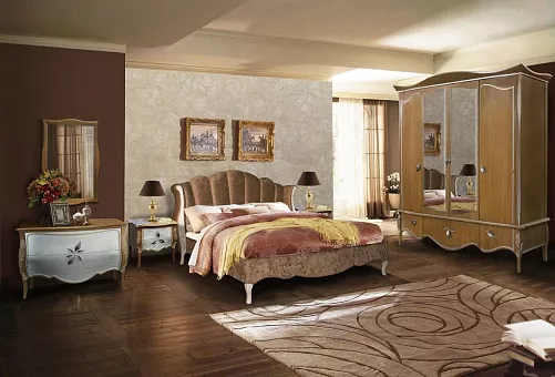 Набор выполнен с использованием массива дуба и шпона на лицевых поверхностях. Украшает изделия использование двух контрастных цветов, лицевая фурнитура в виде лепестков, объёмный вид накладок ящиков. Крышка тумбы прикроватной, ножки, карниз, рамы дверей, зеркала, вертикальные бруски стенок боковых из массива дуба. В ящиках вкладыши облицованные тканью.