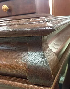 Изогнутые линии, искусно вырезанное кружево из дерева, налёт старины делают спальню безупречно красивой, солидной, удобной. Кроме классического варианта — шкаф, кровать, тумба прикроватная, комод, здесь Вы найдёте и многофункциональный туалетный стол с трёхстворчатым зеркалом – трильяж, и банкетку, и сундук на котором приятно сидеть и можно хранить постельные принадлежности.
