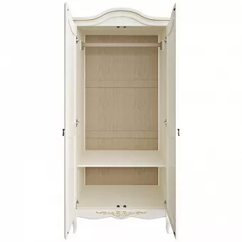 Платяной двухстворчатый шкаф отлично дополнит интерьер прихожей, гостиной или спальни в стиле французской классики. Изысканный внешний вид дополнен роскошными элементами декора, а основной цвет «слоновая кость» отлично сочетается с золотом. Внутри есть штанга для хранения верхней одежды и просторное отделение для обуви. Массив бука, из которого изготовлен шкаф, является гарантией длительного срока службы мебели. Возможно изменение внутреннего наполнения. Требуется сборка.