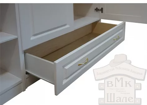 Шкаф "Прайм 3.2" имеет три распашных фасада и два выкатных ящика на роликовых направляющих. Это позволяет рационально использовать все его внутреннее пространство. Филенчатые фасады придают изделию уникальный стиль.