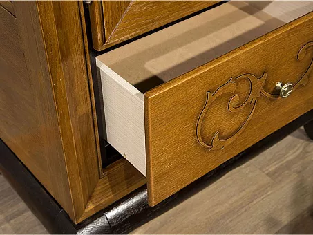 Набор выполнен с использованием массива дуба и шпона на лицевых поверхностях. Украшает набор витиеватая инкрустация деревом по дереву, повторяющаяся в каждом изделии, что всё вместе создаёт единую композицию, показывает индивидуальность и неповторимость набора. Цокольное основание изделий на профильных ножках, приподнимает изделия над поверхностью, придавая им лёгкость и радуя глаз. В ящиках вкладыши облицованные тканью. Стеклянные филёнки с декоративным узором. Тумба с откидной стеклянной дверью.