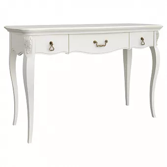 Отличительной особенностью этого стола-консоли является эффектный внешний вид и функциональность. Длинные точеные ножки поражают своей простотой и изысканностью, которая характерна для стиля «прованс». Основной цвет – «слоновая кость», дополненная золотом, подчеркивает романтический образ и придает внешнему виду нотки роскоши. Для хранения различных вещей предусмотрены три выдвигающихся ящика с фасадами оригинальной формы. Требуется сборка.