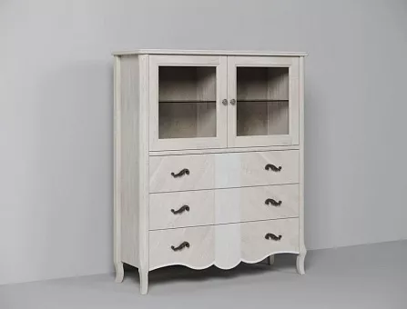 Набор выполнен с использованием шпона и массива дуба на лицевых поверхностях. Украшают набор: фигурный набор шпона, декоративные элементы с выдавленными полосками, подчёркивающими структуру древесины, волнообразные кромки нижних деталей, объёдиняющие все изделия в единую композицию. Зеркало навесное овальной формы прекрасно сочетается с таким же по конфигурации на шкафу. Внутренние поверхности деталей облицованы плёнкой с финиш-эффектом. Крышки из плиты ДСП, облицованной шпоном и бруском дуба с профильным фрезерованием по лицевым кромкам.