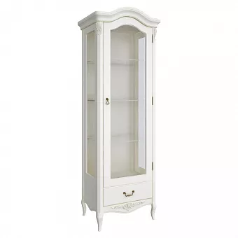 Стеклянная витрина, изготовленная из массива бука, может быть использована в качестве отдельного предмета мебели или стать частью комплексного гарнитура – горки или стенки в гостиную или зал. Изысканный стиль исполнения подчеркивают плавные линии и элементы декора, имитирующие резьбу.